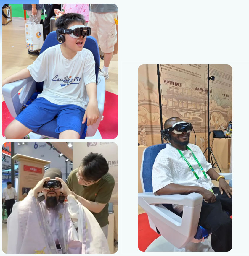 无界XR影院系统作为集成式创新的代表,将头显、座椅、渲染服务器、播控平台、内容生态全部打通,形成“一椅一影院”的极致观影体验。双目8K定制头显仅180克,60帧高刷新率有效减轻眩晕;6DoF交互+360°旋转座椅;TMS全流程播控系统。一位从外地赶来的技术体验者表示:“所有东西浑然一体,坐进去的瞬间,头显、座椅、画面、声音完全同步。” 不少体验完的游客主动询问,今后能否将这款XR座椅购买回家,用于日常休闲观影。